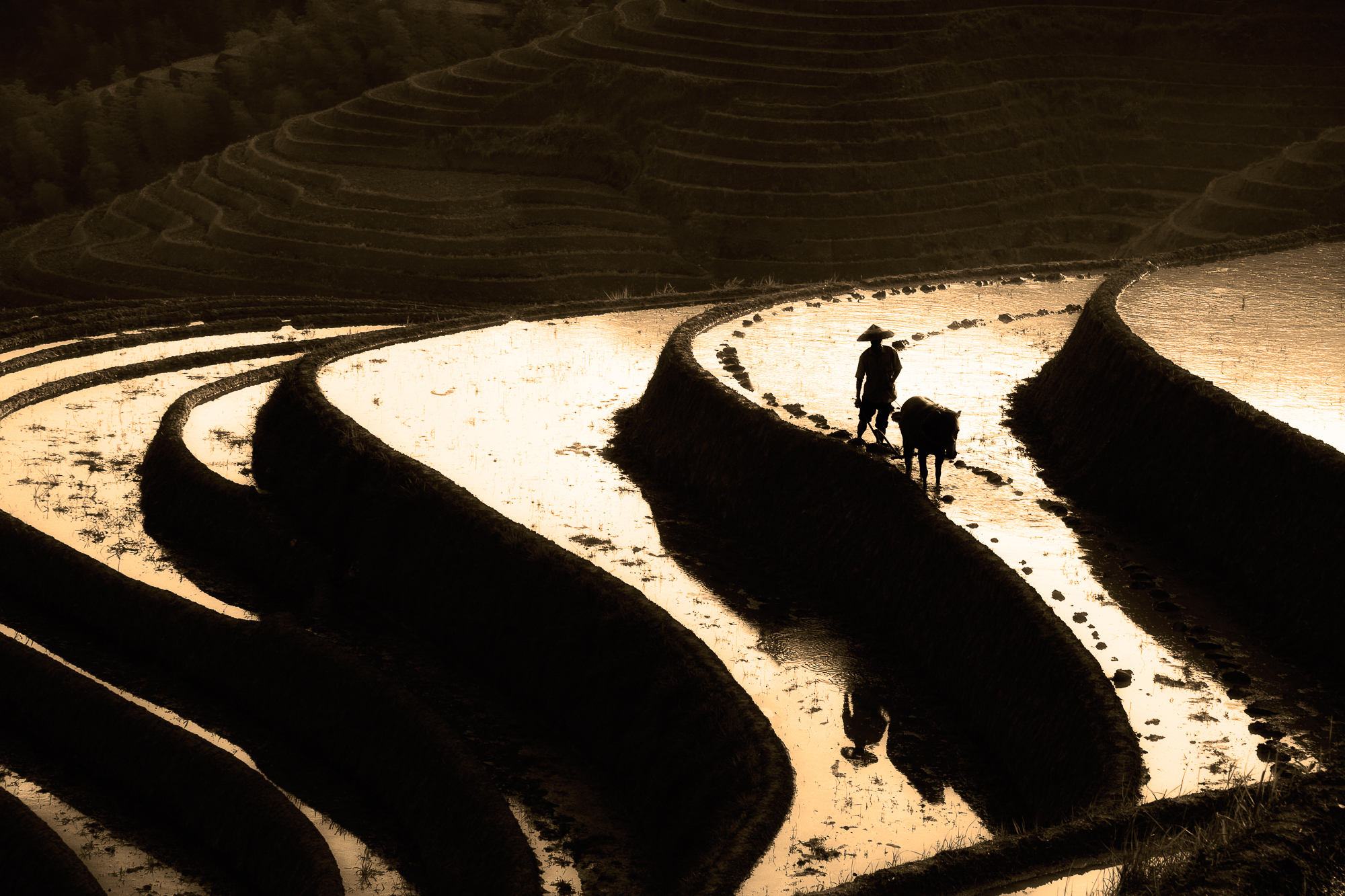 In a recent newspaper, there was a picture of a faraway man leading his working animals through rice paddies in China today.