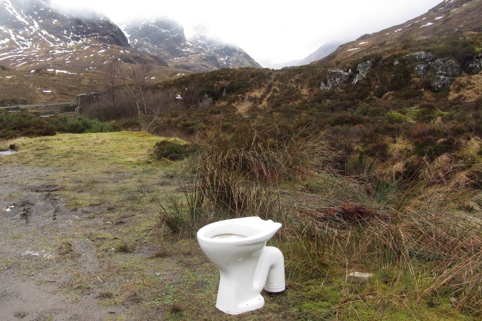 When I left the house (newspaper run) I looked to my right – dumped toilet and cistern.